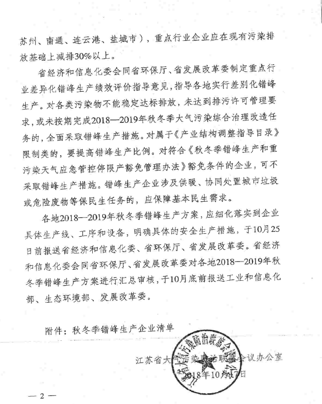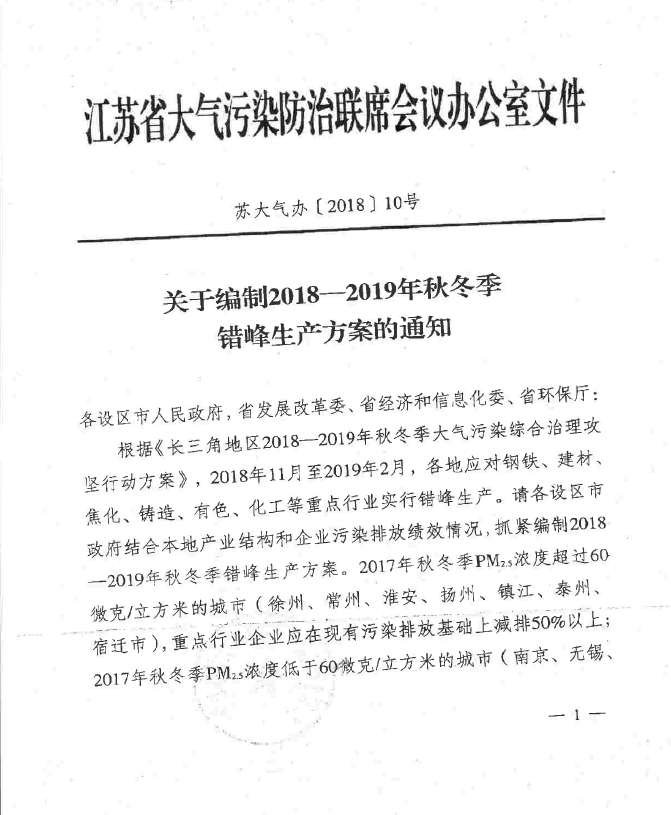 10月17日江苏省大气办发布文件要求,根据《长三角地区2018-2019年秋冬季大气污染综合治理攻坚行动方案》,2018年11月至2019年2月,各地应对钢铁、建材、焦化、铸造、有色、化工等重点行业实行错峰生产。其中,2017年冬季PM2.5浓度超过60微克/立方米的城市(徐州、常州、淮安、扬州、镇江、泰州、宿迁市),重点行业企业在现有污染减排基础上减排50%以上;2017年秋冬季PM2.5浓度低于60微克/立方米的城市(南京、无锡、苏州、南通、连云港、盐城市)重点行业企业在现有污染排放基础上减排30%以上。