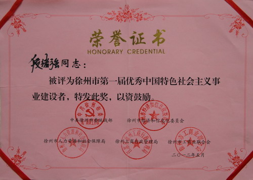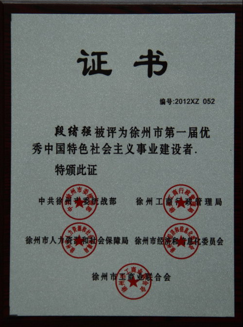 由中共徐州市委统战部、徐州市经济和信息化委员会、徐州市人力资源和社会保障局、徐州市工商行政管理局和徐州市工商业联合会共同组织开展的“徐州市第一届优秀中国特色社会主义事业建设者”评选活动揭晓,公司董事长段绪强先生榜上有名。获奖荣誉证书和证匾(编号:2012 XZ 052)。