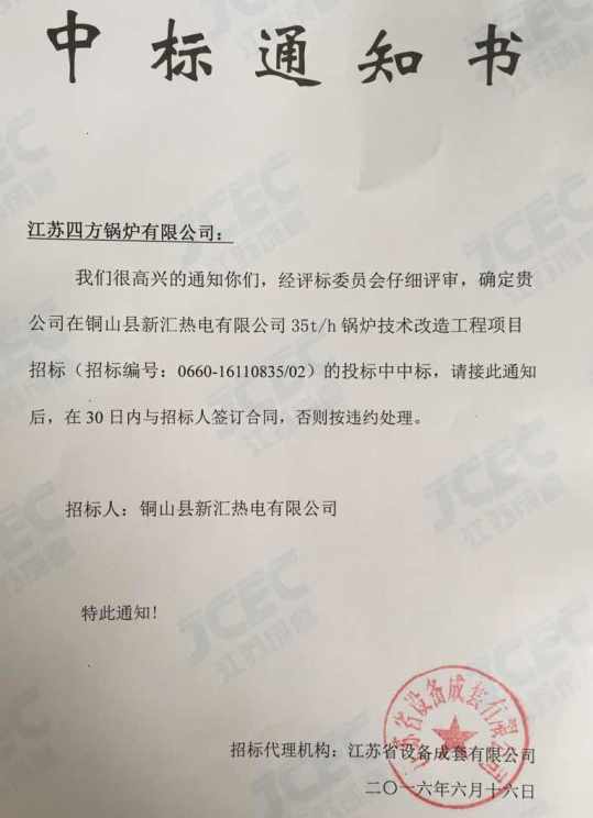 日前,江苏省设备成套有限公司向我公司发来《中标通知书》,在该公司“新汇热电有限公司35T/H锅炉技术改造项目”招标中,我公司凭借在企业资信、技术方案、服务保障、合理性价等方面的综合实力,一举中标。