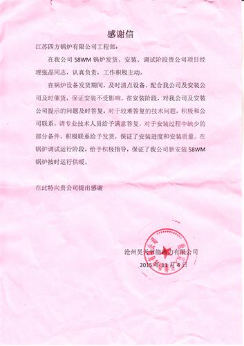 近年来,我公司与沧州昊天节能热力有限公司建立了良好的业务合作关系。公司工程项目部经理牢记职责,恪尽职守,急为客户所急,想为客户所想,积累了良好的信誉记录。本次58MW锅炉项目经理张晶同志以实际行动,再次践行了四方锅炉“客户至上,信誉为本”的服务宗旨,受到了客户的由衷感谢,为双方深化业务合作做出了突出的贡献。