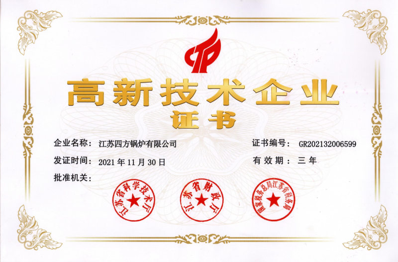江苏四方锅炉再次顺利通过高新技术企业认定复审工作。近日,收到由江苏省科学技术厅、江苏省财政厅、国家税务总局江苏省税务局联合颁发的 《高新技术企业》证书(证书编号:GR202132006599),有效期为三年。