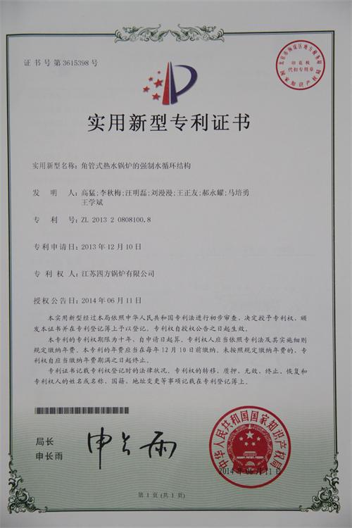 日前,由我公司技术研究院研发申报的《角管式热水锅炉的强制水循环结构》项目,获得国家知识产权局实用新型专利认定,领取了备案证书(证书号第3615398),专利号:ZL 2013 2 0808100.8。该实用新型专利主要由本公司技术研究院高猛;李秋梅;汪明磊;刘漫漫;王正友;郝永耀等发明。 按照公司有关奖励政策,对本公司发明人兑现了奖励。