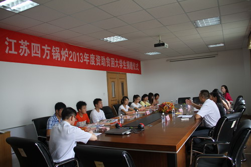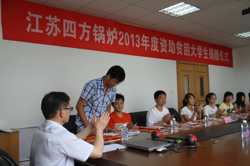 在当日的捐赠仪式上,公司总经理叶枫代表四方锅炉作了洋溢的讲话。他首先祝贺受助大学生金榜题名,简要介绍了企业创业及发展情况及扶危济困捐资助学的传统做法,殷切希望受助大学生不怕困难,认真学习,全面发展,争做德才兼备富有爱心的接班人。区总工会副主席刘敏高度评价了我公司董事长带头、坚持十多年捐资助学不间断的善行,此举已经成为四方锅炉的一大“品牌”。她充分肯定了我公司近年来的工会工作取得的成绩,亲切勉励贫困学子珍惜爱心,迎难而上,刻苦学习,争取早日成才,回报家乡和社会,并以此为动力,传递爱心,发扬光大。受助大学生代表张永康作了表态发言。
