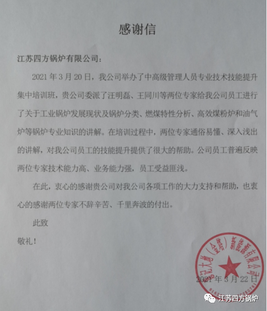 专业高能赢得客户赞誉——江苏四方锅炉新又收到客户感谢信