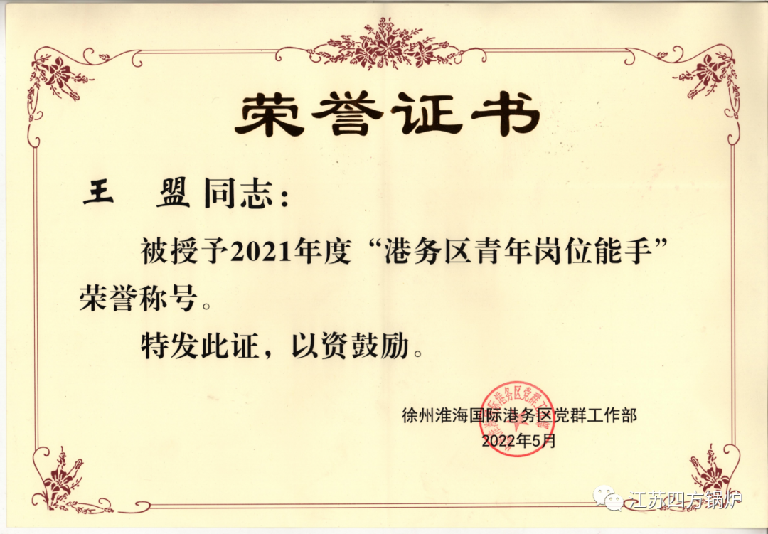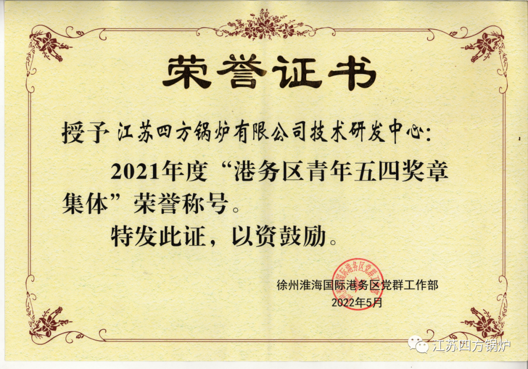 日前,徐州淮海国际港务区党群工作部授予江苏四方锅炉有限公司(简称“江苏四方锅炉”)技术研发中心2021年度“港务区青年五四奖章集体”荣誉称号;该中心技术三部部长王盟荣获“港务区青年岗位能手”称号。