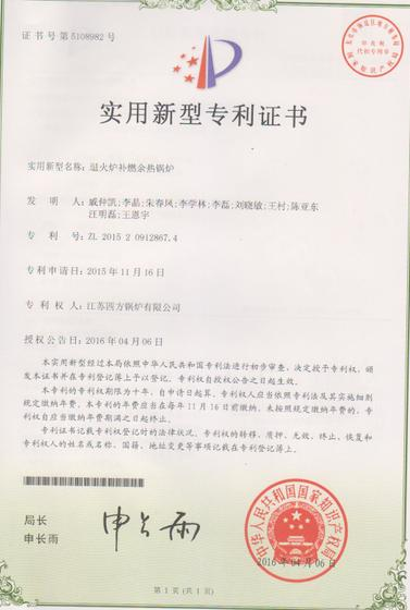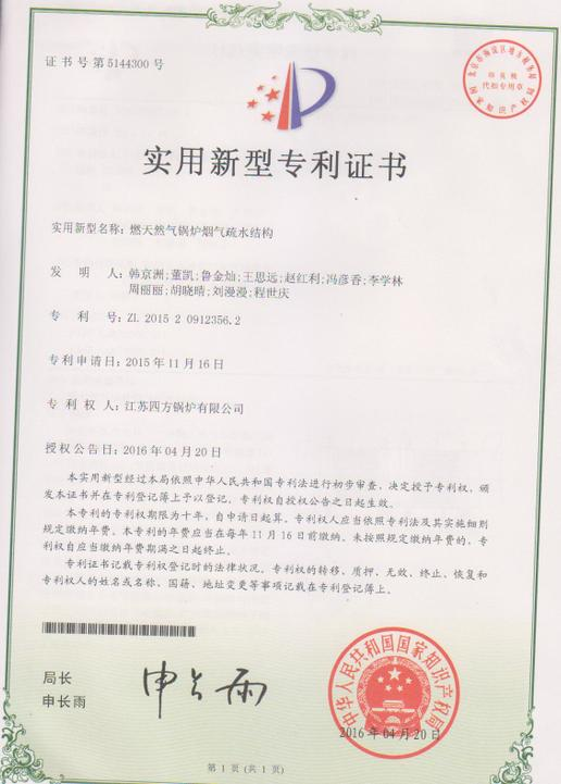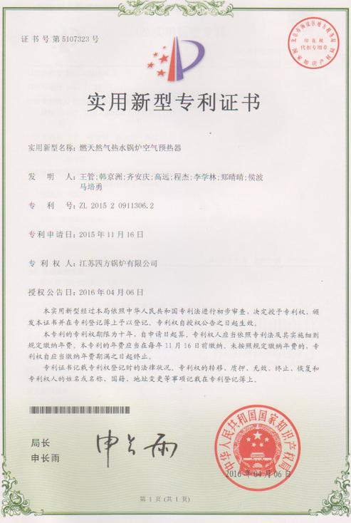 日前,我公司自主研发的SZS46-1.25/130/70-YQ(L)型燃气冷凝锅炉产品获得三项实用新型专利认定。专利证书名称分别为:《一种退火炉补燃余热锅炉》;《燃天然气热水锅炉空气预热器新型结构》;《燃天然气锅炉节能器、冷凝器烟气疏水结构》。