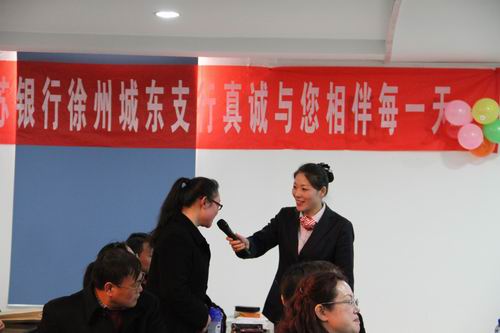 当日下午3时许,西区工程公司及生产部办公大楼三楼活动中心灯火辉煌,彩球簇簇,红底白字的“江苏银行徐州城东支行真诚与您相伴每一天”横幅格外醒目。来自江苏银行及该行城东支行的部分负责人、业务代表早早来到活动现场,与我公司办公室、财务部工作人员一起动手,把活动现场布置得隆重而又喜庆。本次活动先后进行了江苏银行及城东支行发展情况介绍、银企联谊情况回顾、银行产品推介、银信知识学习及抢答竞赛、现场抽奖等程序。至当晚约6时,近3个小时的活动丰富多彩、高潮迭起,给现场人员留下了美好的回忆。