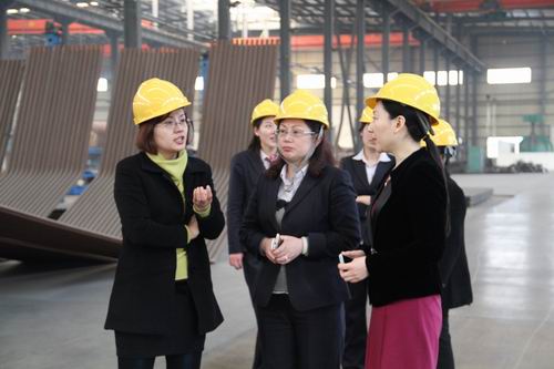 图为姜红总监陪同江苏银行及城东支行负责人参观生产现场