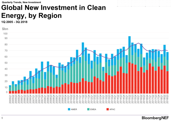 根据研究公司Bloomberg NEF(BNEF)的最新权威数据,2018年第三季度全球清洁能源投资为678亿美元,比去年同期下降6%。