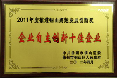日前,中共徐州市铜山区委、徐州市铜山区人民政府隆重召开表彰大会,对全区“2011年度推进铜山跨越发展创新奖”进行表彰。我公司荣获企业自主创新十佳企业荣誉称号,领取了铜牌和10万元奖金。