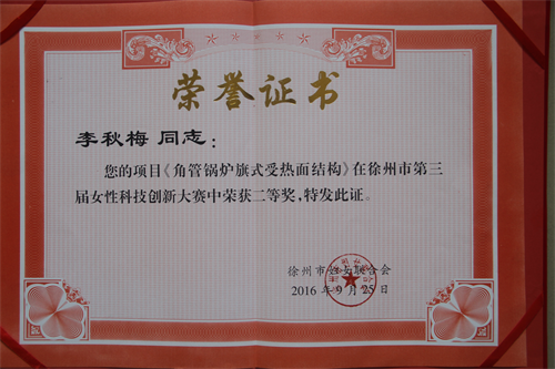 全市广大女性科技工作者、知识分子等踊跃参赛,立足岗位实际,积极开展各项科技攻关、创造发明、技术革新等,取得了一批创新型、实用性的科研成果,参赛作品包含农业、卫生、工业、综合等多个门类。由本公司技术研发中心李秋梅同志牵头研发的《角管锅炉旗式受热面结构》项目,获徐州市第三届女性科技创新大二等奖。
